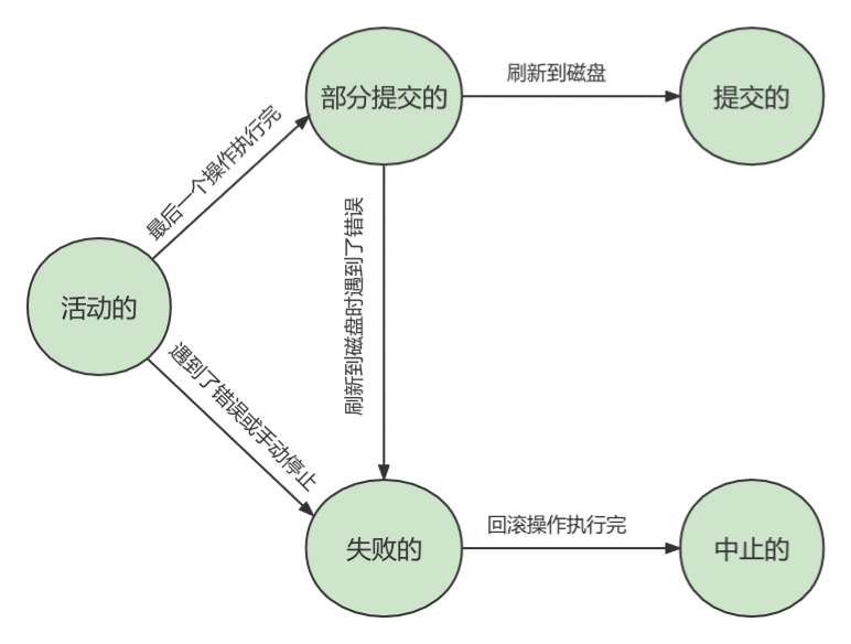 当一个处在部分提交的状态的事务将修改过的数据都同步到磁盘上之后,我们就可以说该事务处在了提交的状态。 一个基本的状态转换图如下所示: