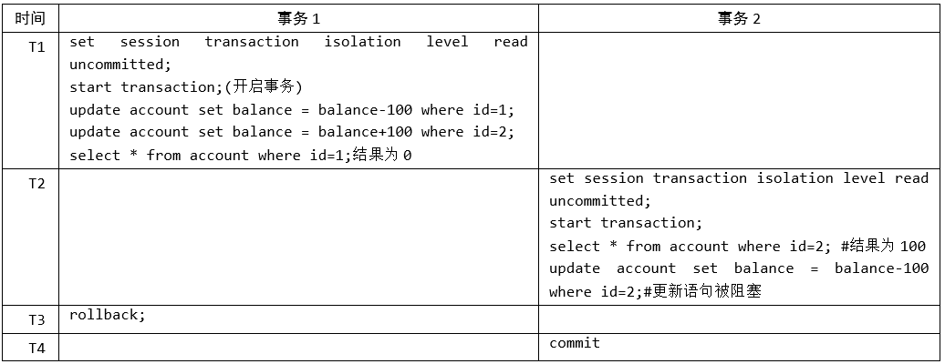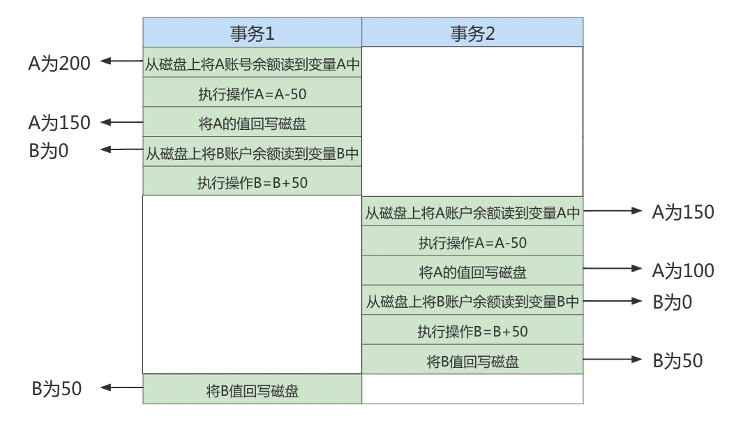 如果无法保证隔离性会怎么样?假设A账户有200元,B账户0元。A账户往B账户转账两次,每次金额为50元,分别在两个事务中执行。如果无法保证隔离性,会出现下面的情形: