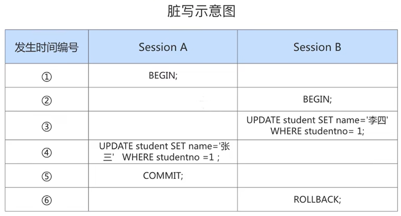 Session A 和 Seesion B 各开启了一个事务,Session B 中的事务先将studentno列为1的记录的name列更新为“李四”,然后Session A 中的事务接着又把这条 studentno列为1的记录的name列更新为“张三”。如果之后Session B 中的事务进行了回滚,那么Session A中的更新也将不复存在,这种现象就称之为脏写。这时Session A中的事务就没有效果了,明明把数据更新了,最后也提交事务了,最后看到的数据什么变化也没有。这里大家对事务的隔离级别比较了解的话,会发现默认隔离级别下,上面Session A中的更新语句会处于等待状态,这里只是跟大家说明一下会出现这样的现象。