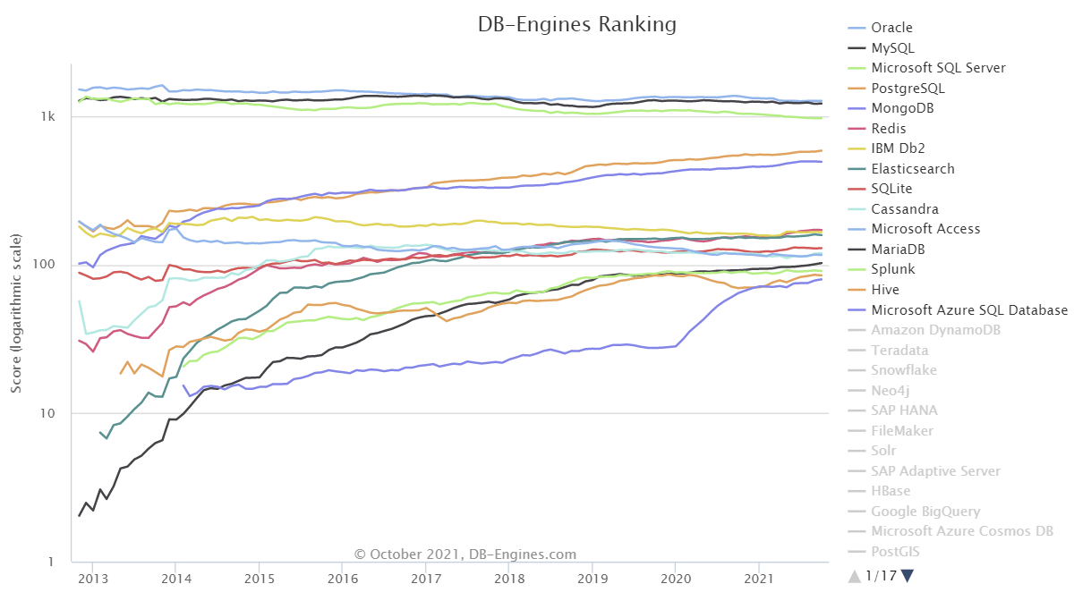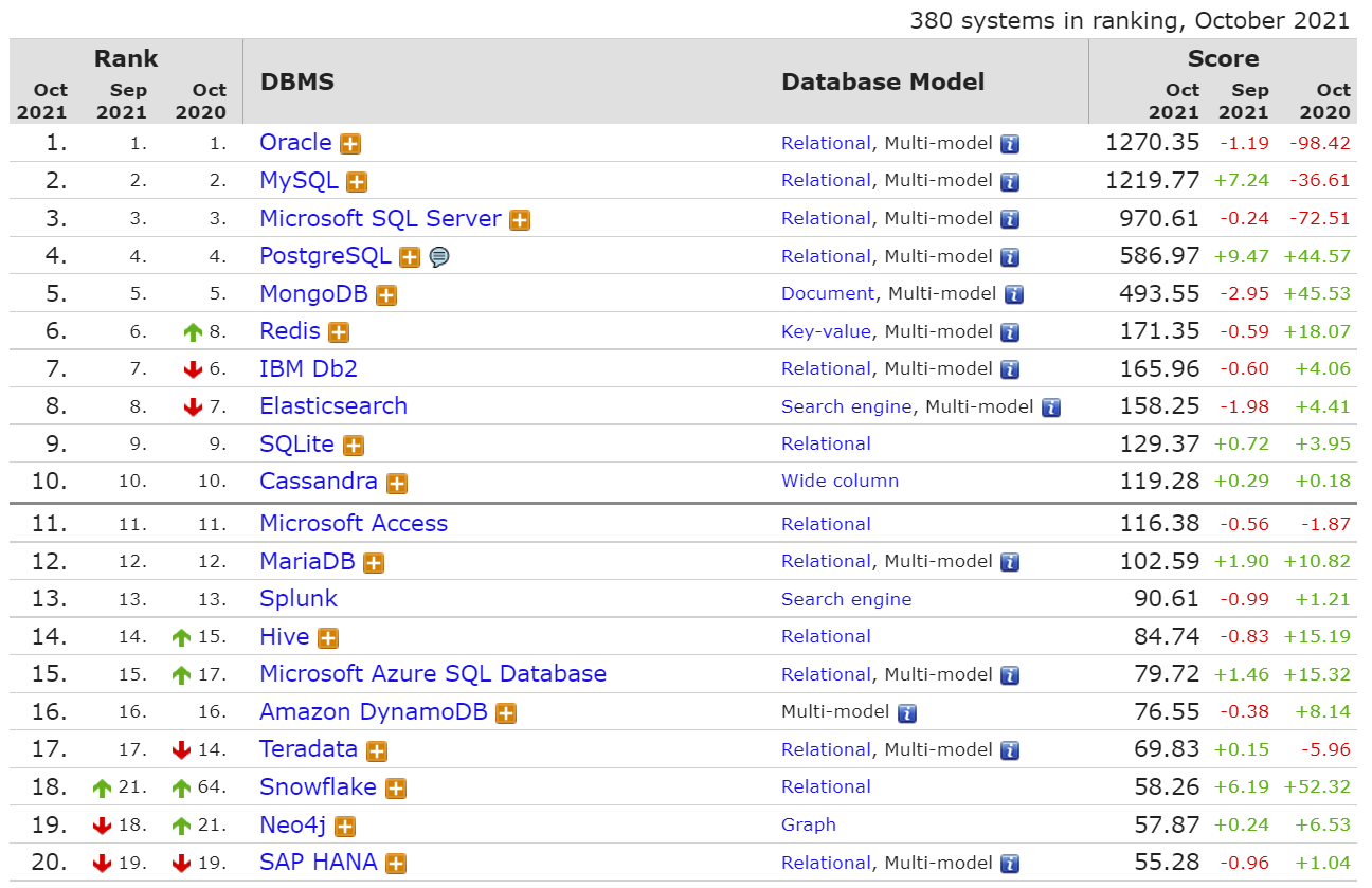 目前互联网上常见的数据库管理软件有Oracle、MySQL、MS SQL Server、DB2、PostgreSQL、Access、 Sybase、Informix这几种。以下是2021年DB-Engines Ranking 对各数据库受欢迎程度进行调查后的统计结果:(查看数据库最新排名: DB-Engines Ranking - popularity ranking of database management systems)
