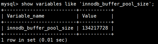 你能看到此时 InnoDB 的缓冲池大小只有 134217728/1024/1024=128MB。我们可以修改缓冲池大小,比如改为256MB,方法如下: