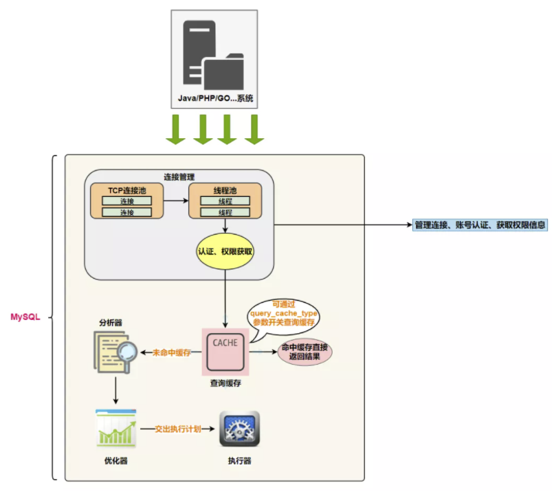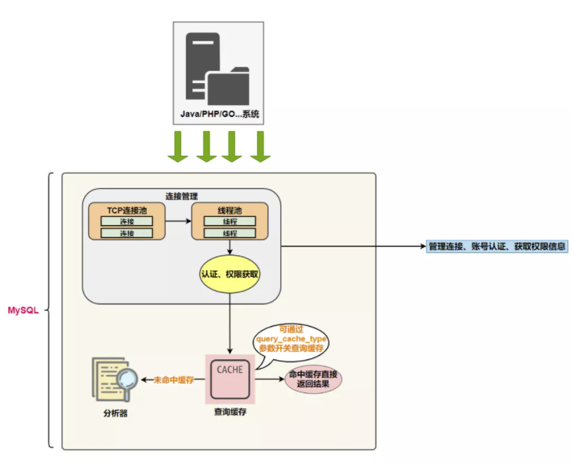 - MySQL内部维持着一些Cache和Buffer,比如Query Cache用来缓存一条SELECT语句的执行结果,如果能够在其中找到对应的查询结果,那么就不必再进行查询解析、优化和执行的整个过程了,直接将结果反馈给客户端。