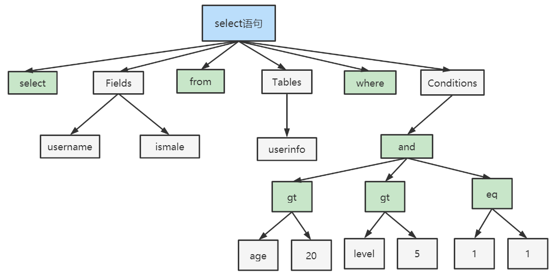 - 在解析器中对 SQL 语句进行语法分析、语义分析。将SQL语句分解成数据结构,并将这个结构传递到后续步骤,以后SQL语句的传递和处理就是基于这个结构的。如果在分解构成中遇到错误,那么就说明这个SQL语句是不合理的。