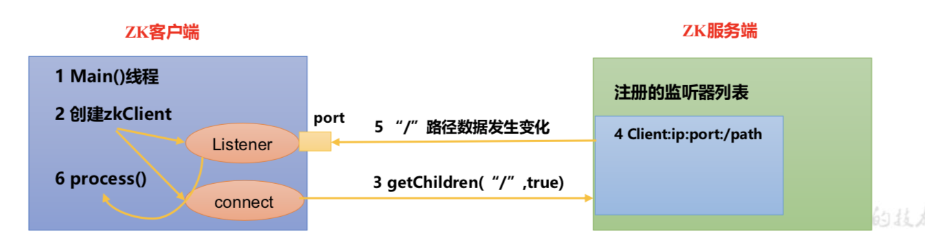 5)Zookeeper监听到有数据或路径变化,就会将这个消息发送给listener线程。