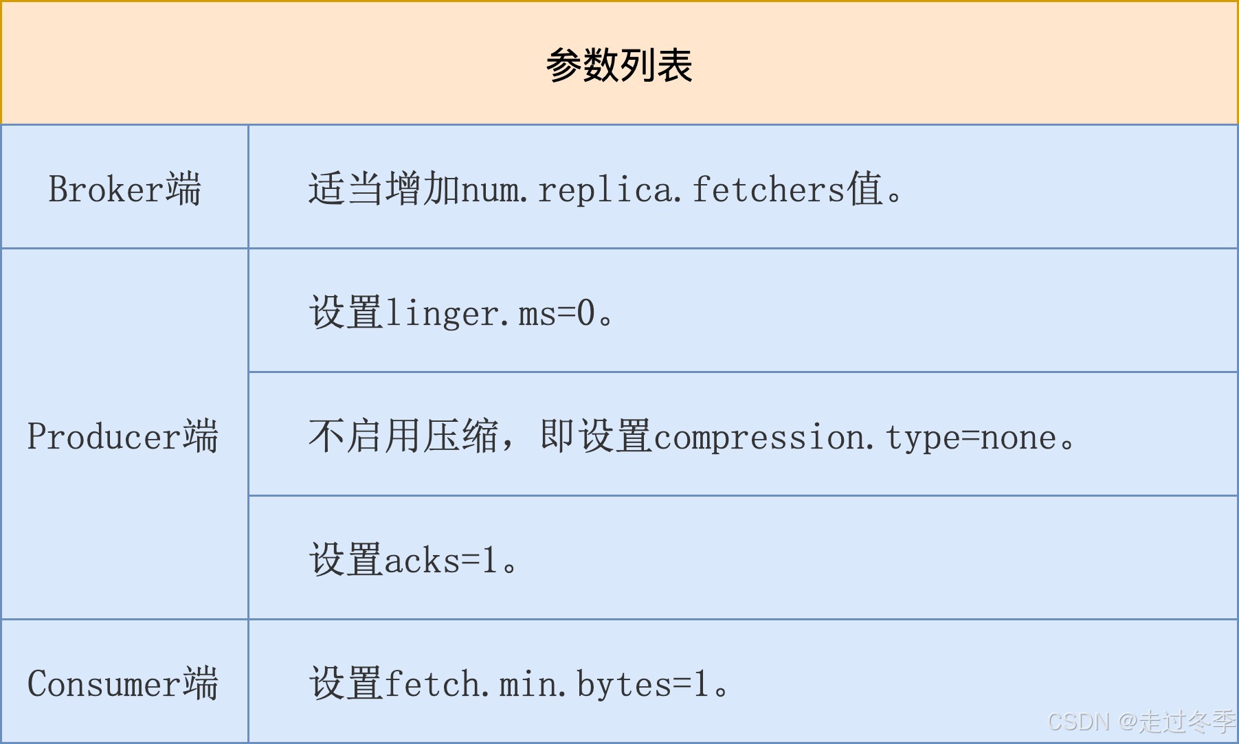 讲完了调优吞吐量,我们来说说如何优化延时,下面是调优延时的参数列表。