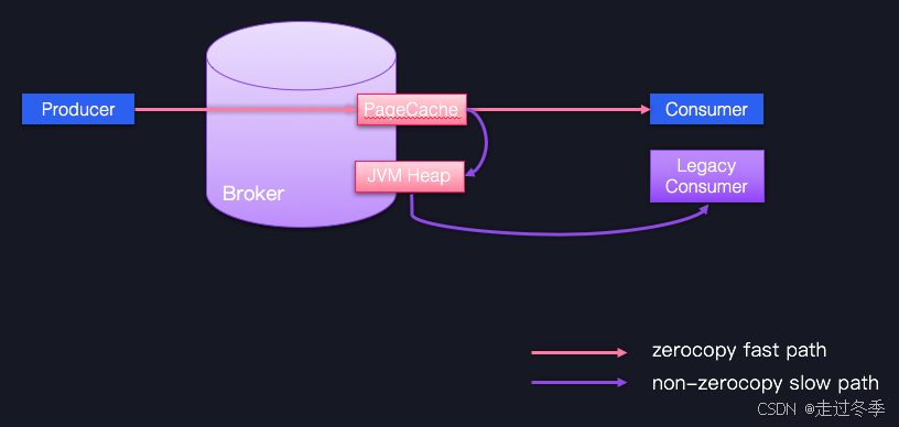 图中蓝色的 Producer、Consumer 和 Broker 的版本是相同的,它们之间的通信可以享受 Zero Copy 的快速通道;相反,一个低版本的 Consumer 程序想要与 Producer、Broker 交互的话,就只能依靠 JVM 堆中转一下,丢掉了快捷通道,就只能走慢速通道了。因此,在优化 Broker 这一层时,你只要保持服务器端和客户端版本的一致,就能获得很多性能收益了。