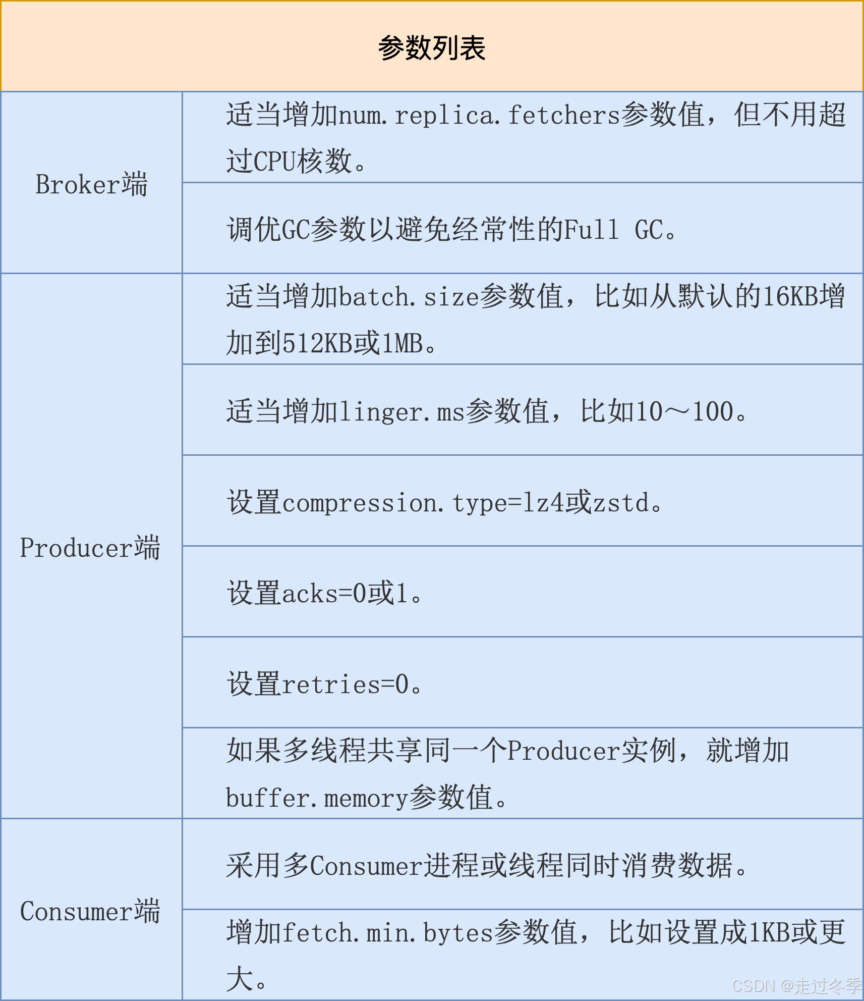 接下来,我会给出调优各个目标的参数配置以及具体的配置原因,希望它们能够帮助你更有针对性地调整你的 Kafka 集群。
