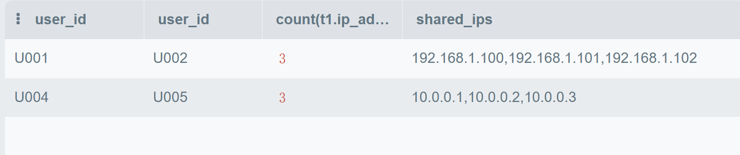 目标:识别共同使用过3个及以上相同IP地址的用户对,用于检测潜在的黑产团伙或账号共享行为。