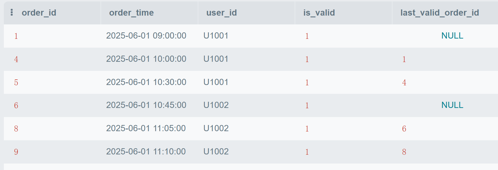 lag( order_id ) over ( PARTITION BY user_id ORDER BY order_time ASC ) AS last_valid_order_id