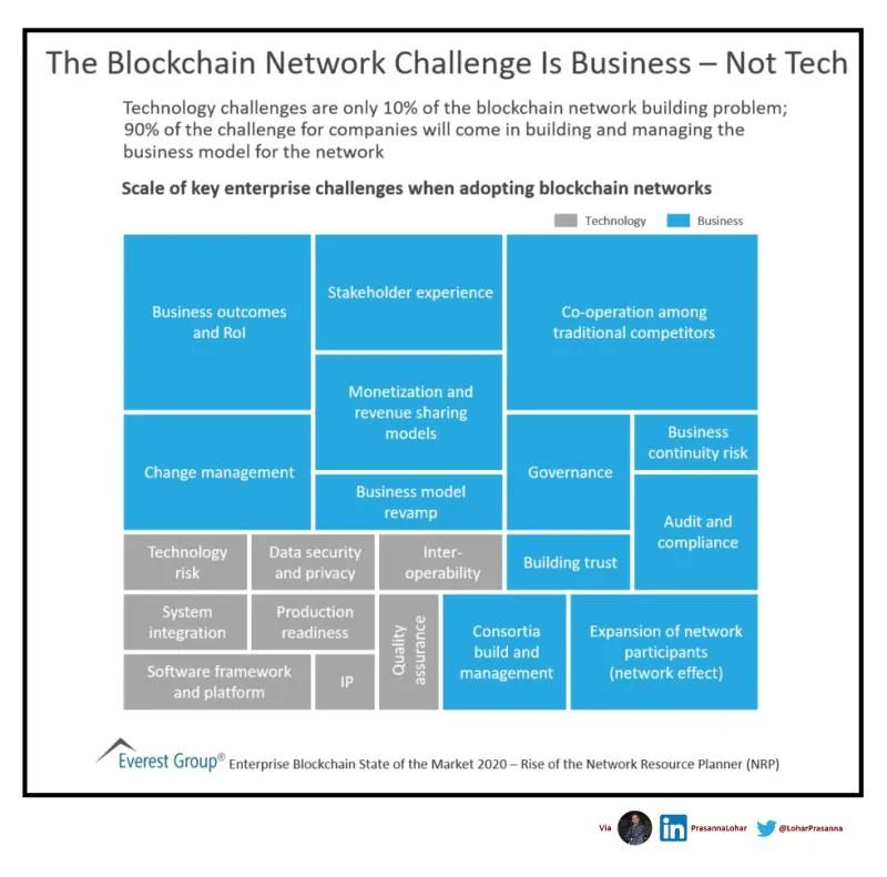 对于区块链而言,技术上的挑战只占10%,90%的挑战是我们如何面对区块链网络构建并管理商业模式。也就是说,如何做关于区块链的生意呢?