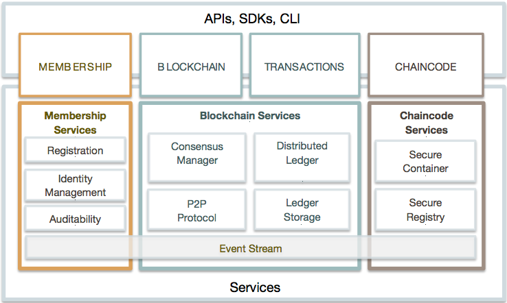 尽管区块链具有浓厚的“经济学”色彩,但是从技术层面看,仍然离不开分布式系统的体系结构。下图是Hyperledger给出的区块链系统功能模块图。