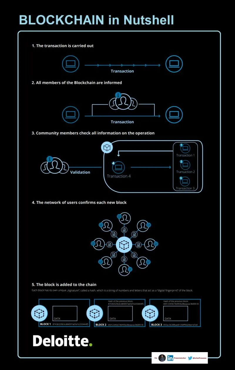 如果难以理解的话,一张图可以把区块链描述成5个环节:
