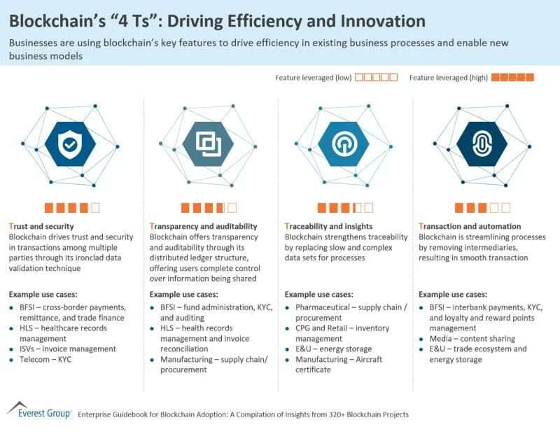 区块链通过其铁证如山的交易数据验证,具有安全可信的特性;通过分布式账本为用户提供对共享信息的完全控制,具有透明审计的特性;通过交易进程中缓慢而复杂的数据集来增强可追溯性;通过没有中间代理的流式处理流程使交易具有自动化特性。面向这4T特性,可以为一些商业模式赋能,实现某些领域的创新。