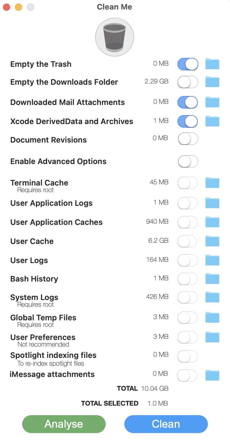 Clean Me 是一个适用于 macOS 的分析器和清理器。它可以一键清理废纸篓、下载文件夹、邮件附件、Xcode 派生文件、应用程序日志和缓存、终端缓存、用户日志和缓存、系统日志等文件。