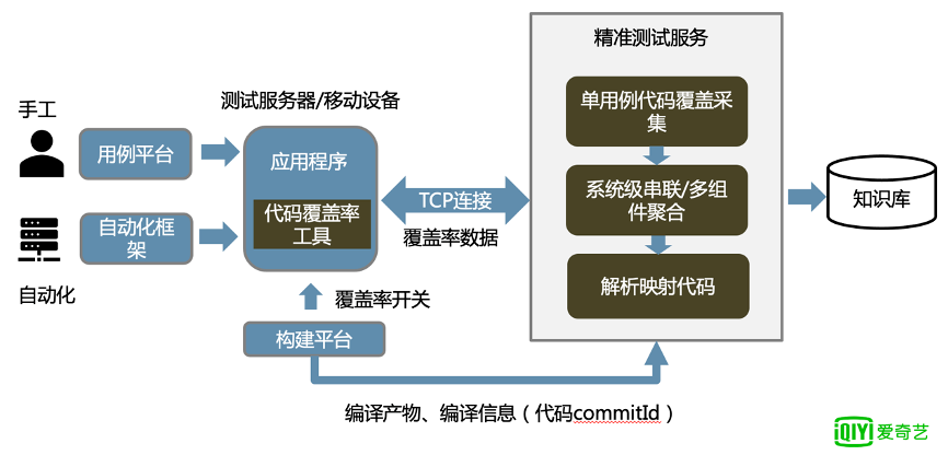 下图是爱奇艺精准测试体系整体架构图,中间的红色部分是核心的精准测试服务,负责建立用例和代码映射关系知识库并根据 GIT 提交记录计算测试范围及影响范围。