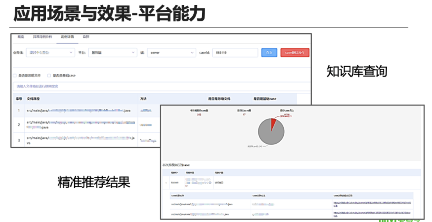 - 当代码发生变动时,可以通过查询知识库,准确找到本次变更的代码影响了哪些测试用例,有针对性地进行回归。
