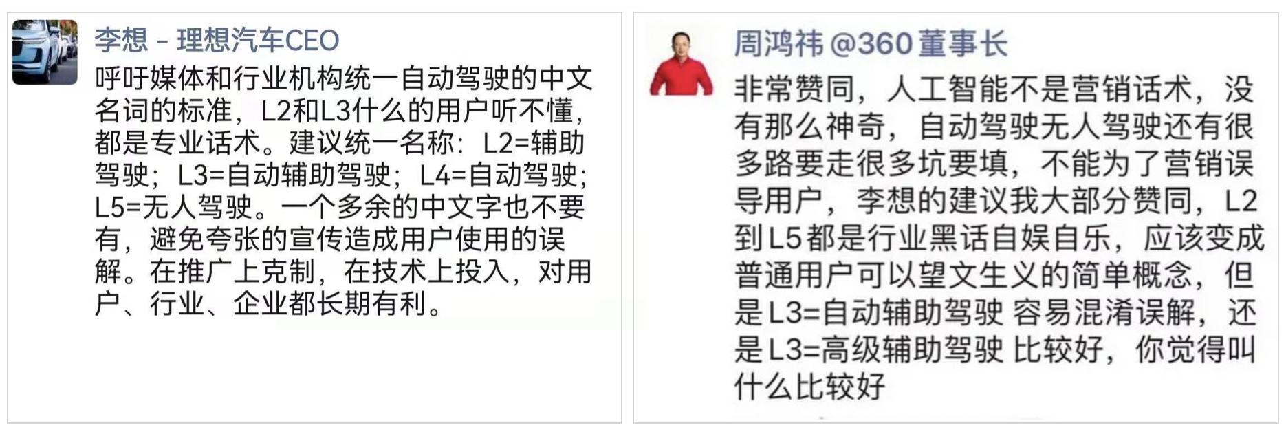 李想和周鸿祎都对自动驾驶等级的界定发表了自己的看法: