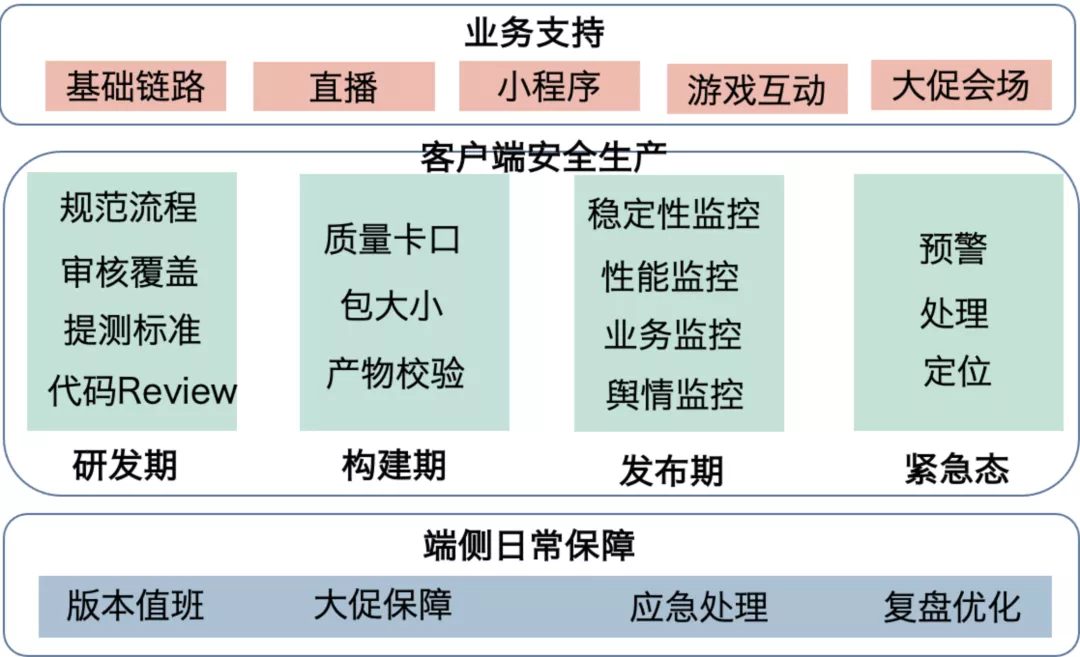 淘宝客户端安全生产,主要分四个阶段:研发期、构建期、发布期和应急态,同时沉淀开发过程数据,围绕数据线上线下异常复盘,为提升代码质量、提升开发能力,进一步完善平台做数据支持,从而提升开发的研发环境,保障线上用户使用体验。