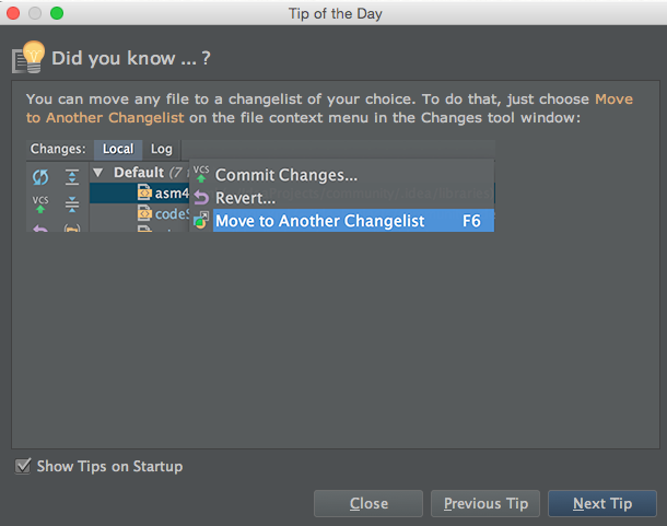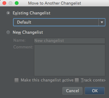 如果你想将某个changelist中的文件转移到其它的changelist, 选中此文件,在弹出的菜单中选择 [Move to Another Changelist].