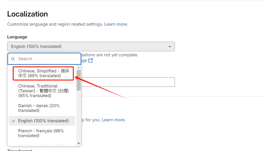 3、滚动至Localization(本地化),将Language修改成“简体中文”