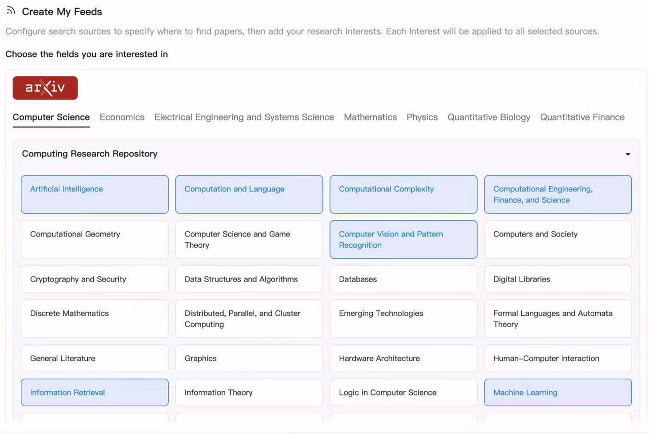 WisPaper最近新出的这个订阅推送功能更像是一个「科研版的小红书」,你选择了自己的研究领域和兴趣后,它就会为你创建一个专属订阅源,并在每天自动推送最新的相关论文。