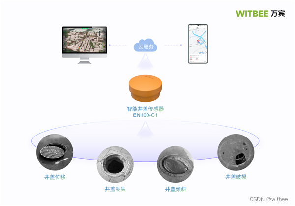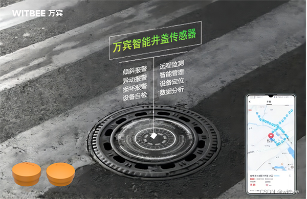WITBEE®万宾®智能井盖传感器是一款井盖异动监测的传感终端。对窨井盖状态(倾斜)进行实时监测。当窨井盖发生倾斜、翻转超过阈值时,智能井盖传感器将立即发送报警信号给软件系统平台,便于工作人员快速定位、及时处理。