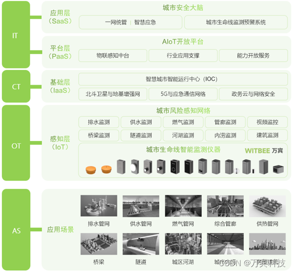 WITBEE®万宾®城市生命线监测预警系统充分利用物联网、云计算、大数据、人工智能等先进信息技术,结合先进的城市安全管理理念,构建全市层面的风险感知立体网络,对城市基础设施风险进行全方位、立体化感知,面向排水异常、供水泄漏、燃气泄漏、热力泄漏、管廊坍塌、桥梁受损、隧道坍塌、建筑坍塌、河湖污染等初步形成城市基础设施全面感知、全面接入、全面监测、全面预警的风险管控体系。