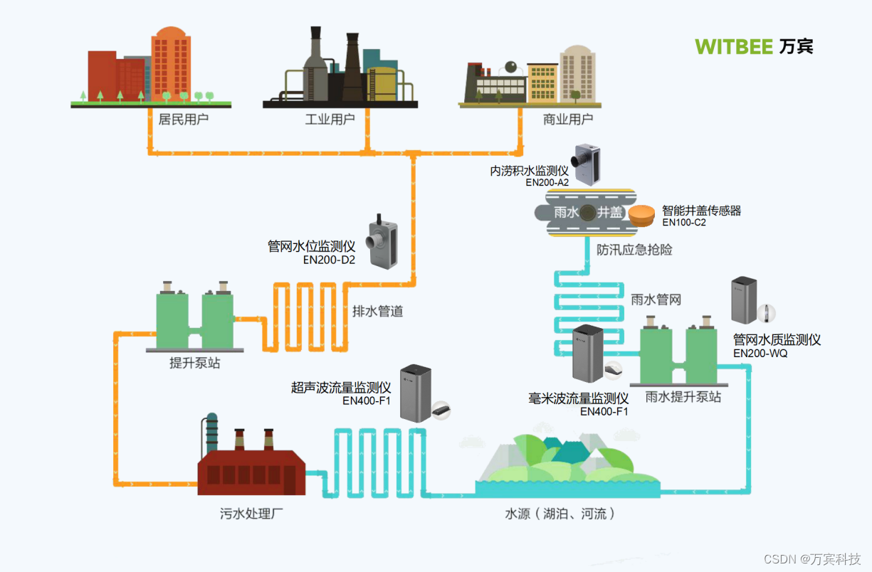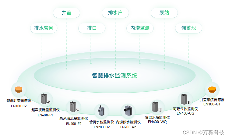 万宾科技基于多年来在城市生命线领域的研究与实践,自主研发了一套基于AIoT智能物联网、大数据、云计算等新一代信息技术的智慧排水监测系统。通过在排水管网、城区易涝点、排放口和排水泵站布设城市生命线智能监测设备,完成排水管网重要节点的水位、井盖异动、流量、流速、水质等动态监测数据采集,并通过物联网、自动化改造,对排水泵站进行数据集成及运行监测,实时监管站点,远程监控站点的设备运行、水质处理情况等。