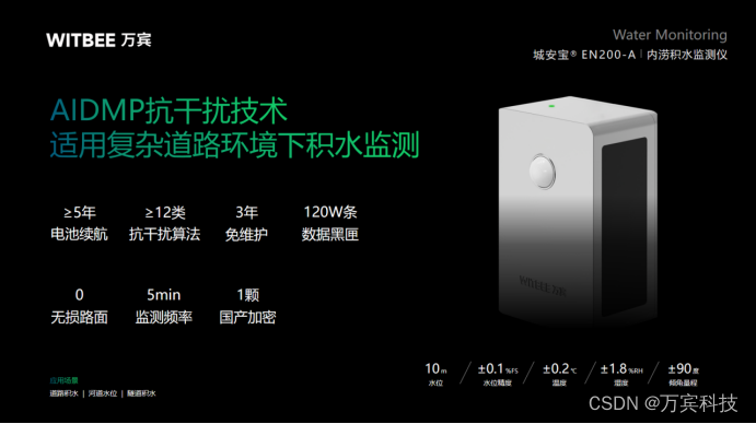 WITBEE®万宾科技®内涝积水监测仪 EN200-A是一种具有实时监测、预警功能的城市排水管理设备,能够对城市易涝点、隧道积水、下穿通道积水等区域进行实时积水监测。它采用的AIDMP技术使其适用于复杂环境,如树叶飘落、人员和车辆流动性强的道路,具有抗雾、抗污、抗干扰能力强等特点。