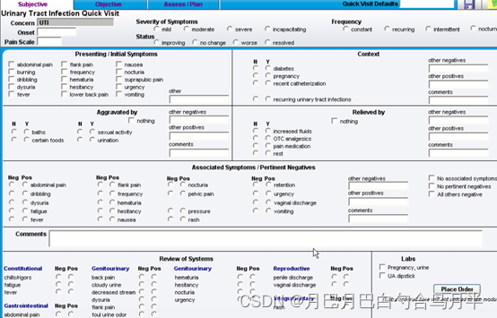 门诊使用基于语音识别的智能电子病历相对要少一些。很多系统的门诊系统包含了丰富的模版,美国退伍军人医院在非常早的时候(2010年之前)就通过使用大量的模版来进行处理门诊的数据录入。下面分析中的截图也是来自一些美国退伍军人医院的系统。这些模板是渐进式的、菜单式的。医生和护士在和病人的交流中,通过勾选、点击就能完成门诊数据、门诊病历的处理。这些模版就像乐高积木一样,可以进行搭接,灵活的比较高,医院和医生可以设计自己的模版。