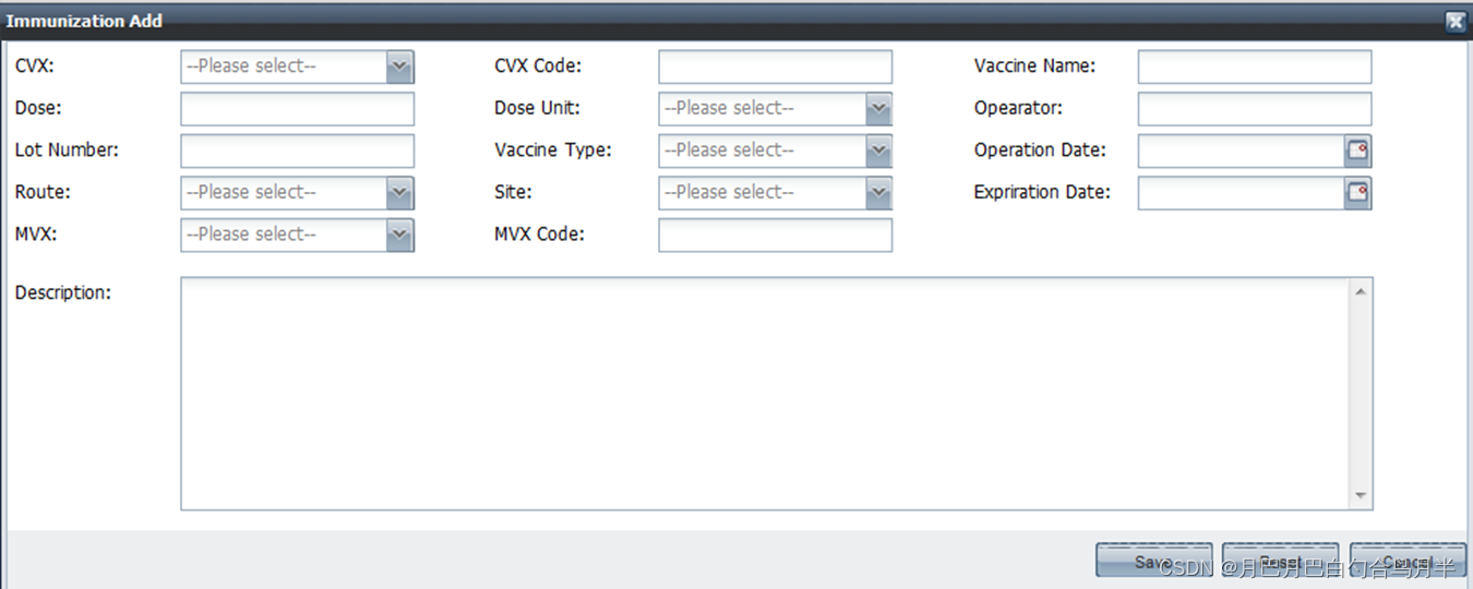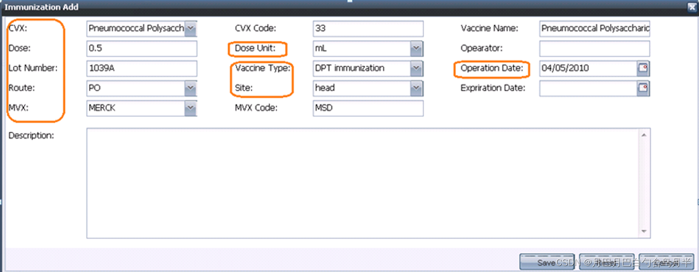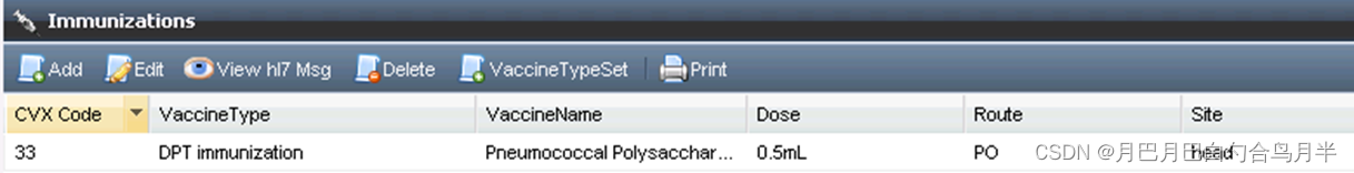 在弹出的add页面下选择CVX,CVX Code字段、Vaccine Name字段会根据所选择的CVX字段内容自动被填充,然后依次添加Dose Unit、Vaccine Type、Route、Site、MVX字段,将如下的Immunization记录录入系统中: