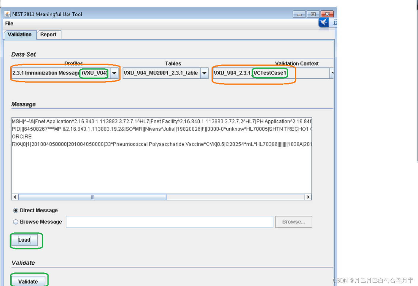 - 选择data set : 要选择 2.3.1 Immunization message,可以从HL7message中看出版本,然后 “Validation context”选择我们录入疫苗所选用的数据集,我们上述步骤中用的dataset1.