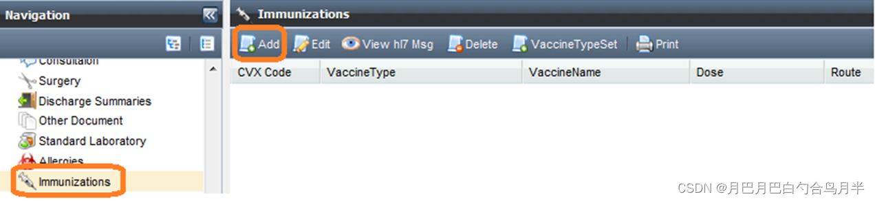 - 以医生D004用户登录,选择病人“Julie Nivens”,点击“Patient Chart”按钮,选择“Immunizations”菜单,再点击“Add”按钮,如下图所示: