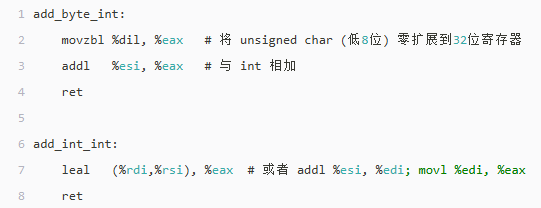 add_byte_int中多了一条movzbl指令(move with zero-extend byte to long),用于将unsigned char(1字节)零扩展为 32 位整数。add_int_int直接使用两个 32 位寄存器相加,无需扩展。