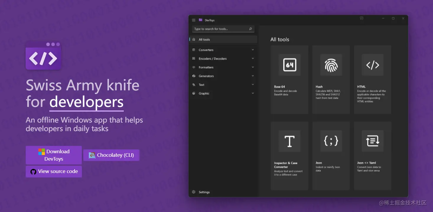 DevToys 有助于处理日常任务,支持14 种不同的工具,包括 Json 到 Yaml、Yaml 到 Json 转换、编码 / 解码、文本比较、图片转换等等。方便开发者处理关于数据方面的简单任务,无需打开其他工具,这是不是就像是一把瑞士军刀。官网链接