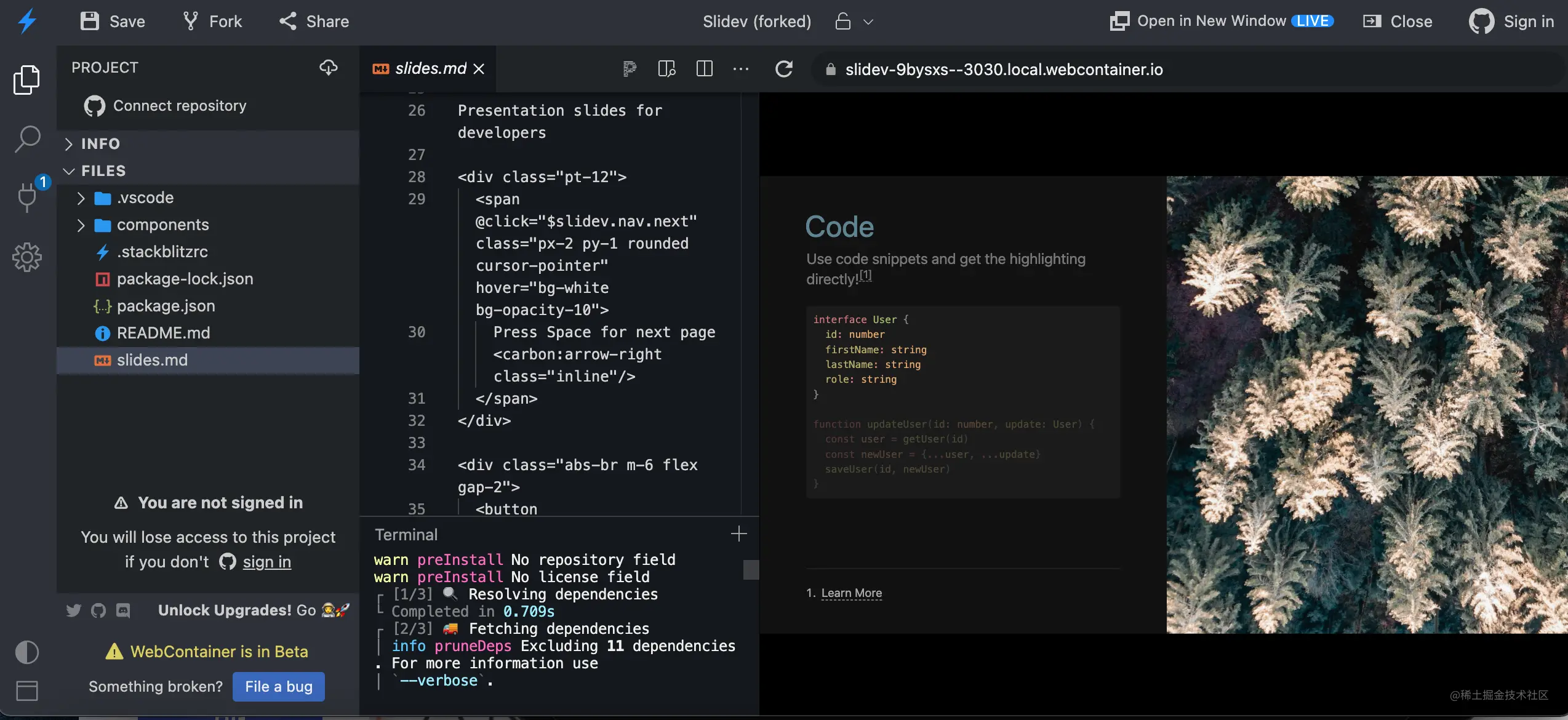 比如我们可以在Stackbitze上基于 slides 搭建你的第一个在线演讲稿(支持markdown)