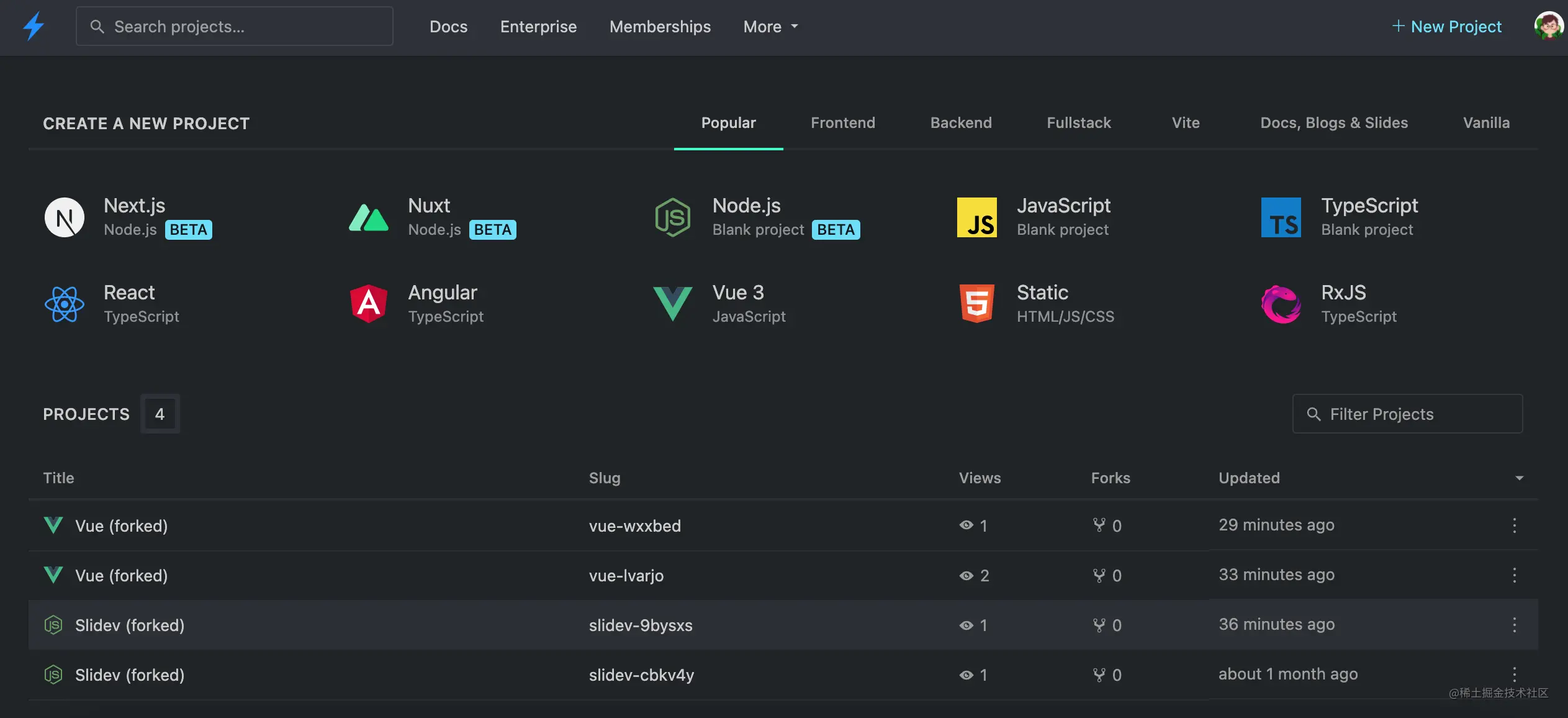 作为开发者,我们经常因为在本地开发项目中,遇到环境搭建问题,甚至因为环境配置低导致体验不佳等等,而在线云开发(在线IDE)就是一种理想的解决方案。即可以直接在浏览器中直接运行Node并安装NPM依赖,甚至直接类似脚手架一样帮我们初始化版本项目。Stackblitz 可以解决! 在线链接