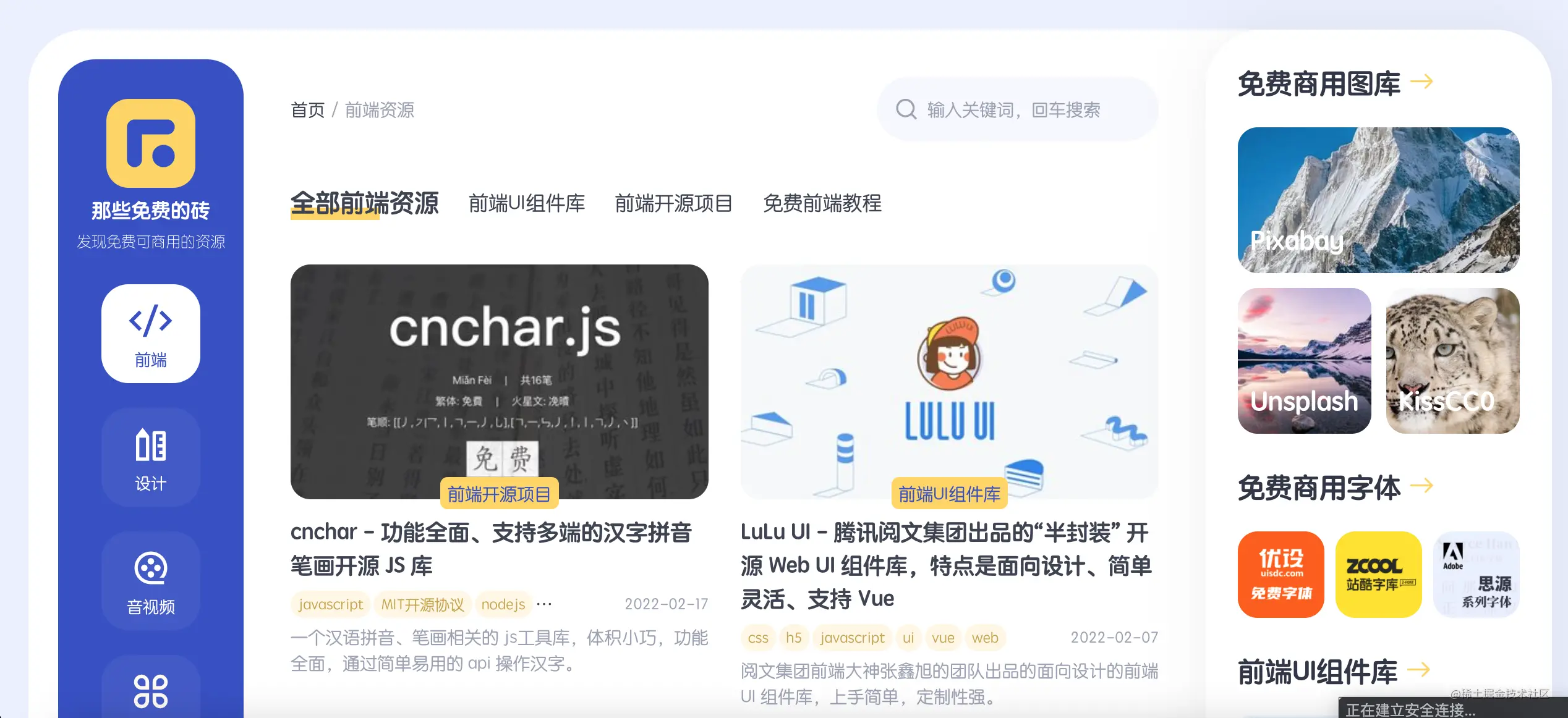 Those Free 中文名称“那些免费的砖”,是一个致力于发现互联网免费可商用资源的网站,涵盖设计、前端开发和生产里应用软件等领域,并提供免费字体下载、免费软件下载。官方链接