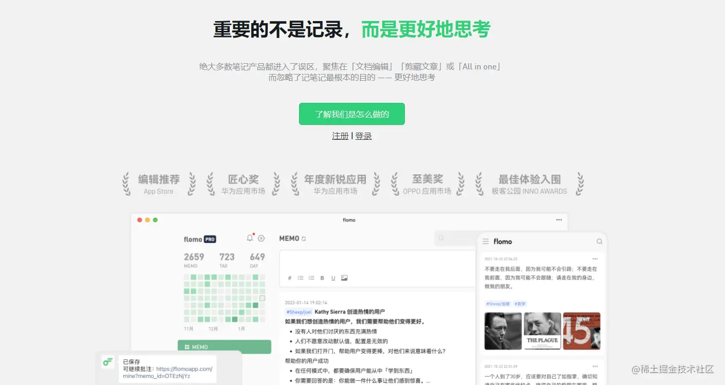 flomo 只专注于记录与整理想法,拒绝 All in on。类似发twitter的输入框,促使记录这件事变成毫无压力的事情,有种类似一种社交动作。同时feed 流的记录展示,就像你在刷微信的朋友圈一样畅通无阻 官方链接