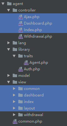 按照以下图片,从【admin】复制到【agent】的对应文件夹下,复制过去后,都要修改一下命名空间【namespace app\agent\...】: