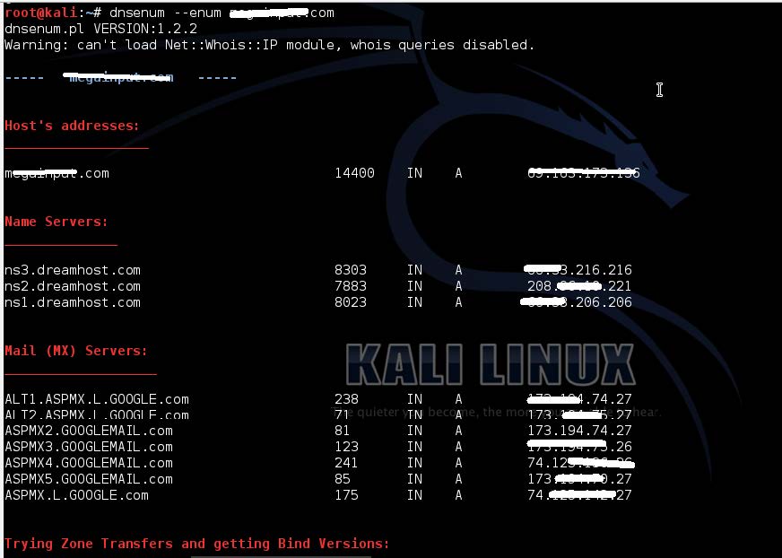 cd /usr/bin ./dnsenum --enum adomainnameontheinternet.com请不要在不属于你的公共网站或者不是你自己的服务器上运行这个工具。这里我们将