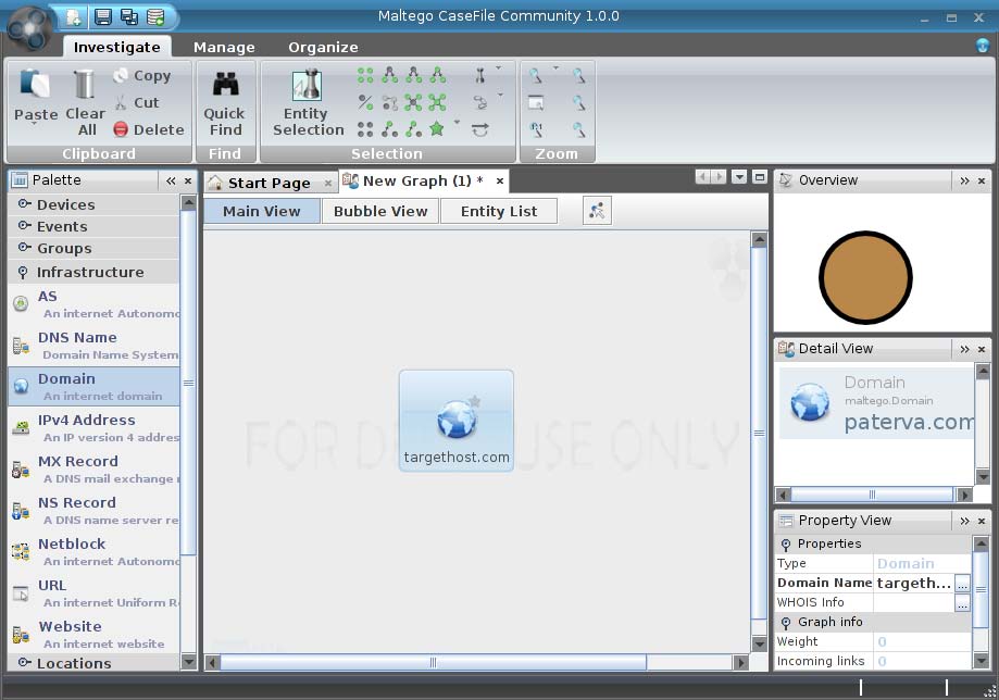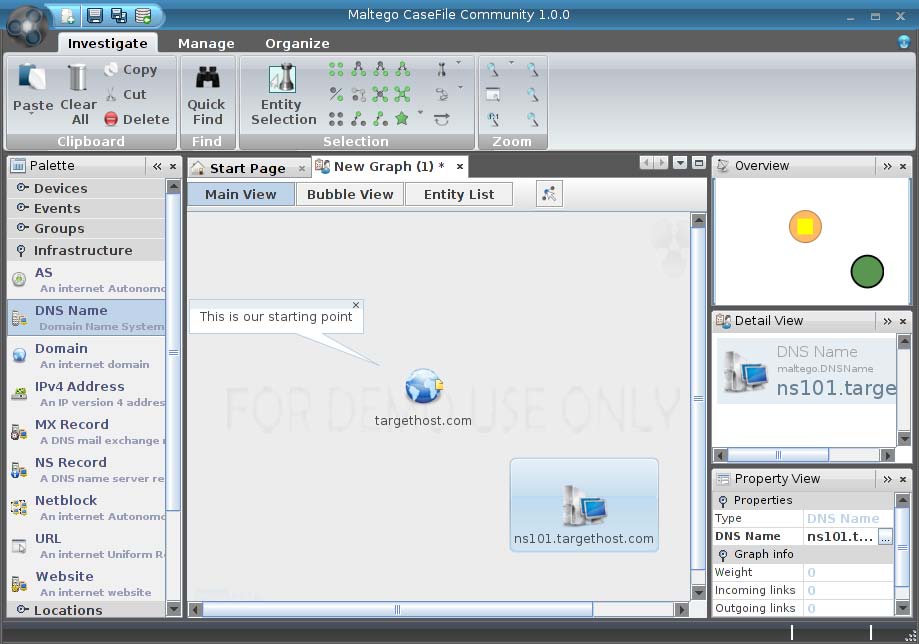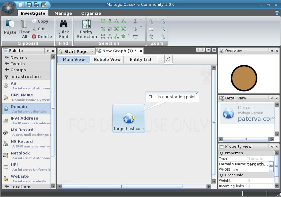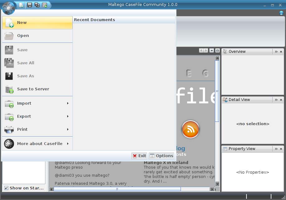 CaseFile就像开发者的网站上那样,相当于不带转换的Maltego,但拥有大量特性。多数特性会在这个秘籍的“操作步骤”一节中展示。