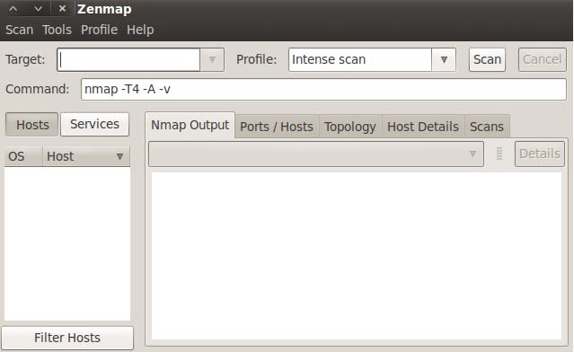 Nmap的GUI版本叫做Zenmap,它可以在终端上执行zenmap命令,或者访问Applications | Kali Linux | Information Gathering | Network Scanners | zenmap来启动。