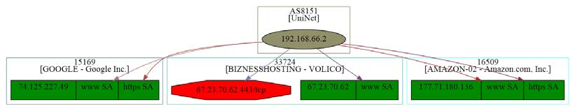 在步骤1中,我们使用了dmitry来获取目标信息。参数-wnspub允许我们在域名上执行WHOIS查询,检索Netcraft.com的信息,搜索可能的子域名,以及扫描TCP端口。选项-o允许我们将结果保存到文本文件中。在步骤3中,我们建立了一个简单的ICMP netmask请求,带有-s选项,来输出IP地址和子网掩码。接下来,我们使用scapy来执行目标上的并行路由跟踪,并在表格中展示结果。在步骤7中,我们在不同主机的80和443端口上执行了TCP路由跟踪,并且将最大TTL设置为20来停止这个过程。在获得结果之后,我们创建了它的图片表示,将它保存到临时目录中,同时创建了相同结果的3D表示。最后,我们退出了scapy。