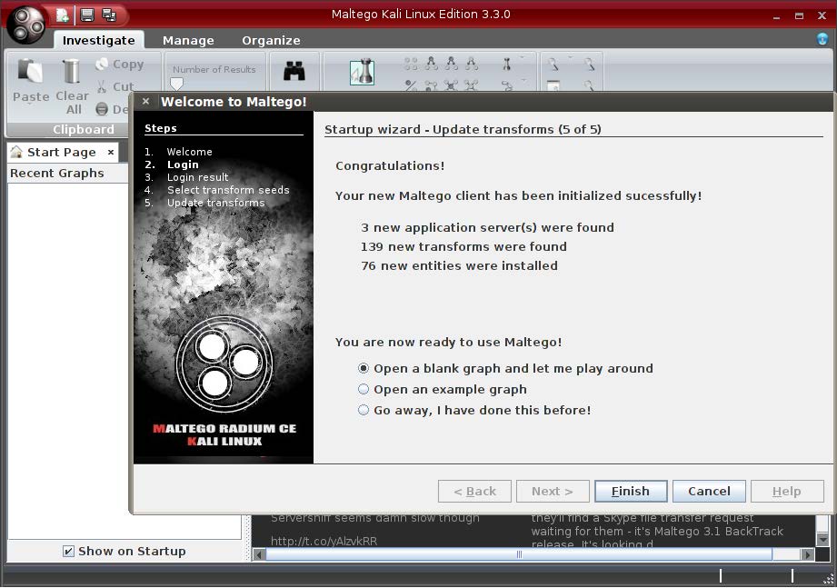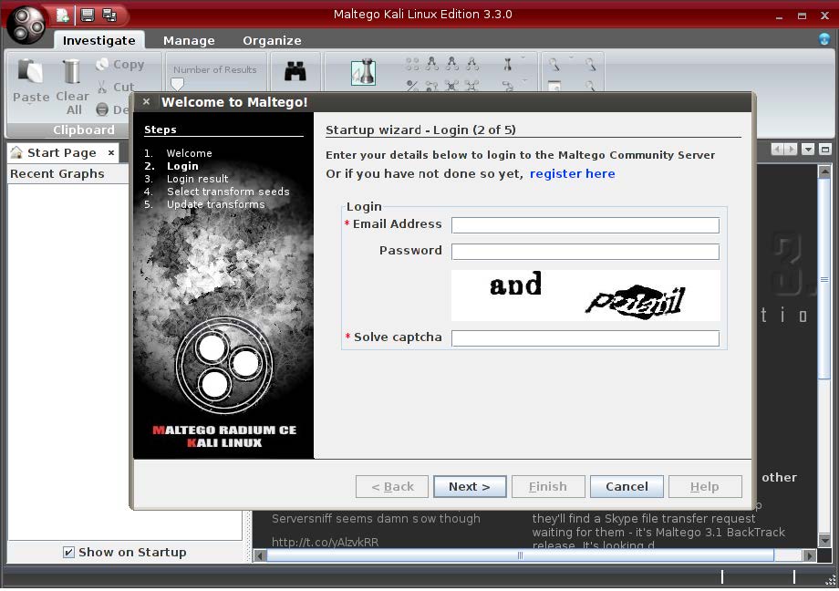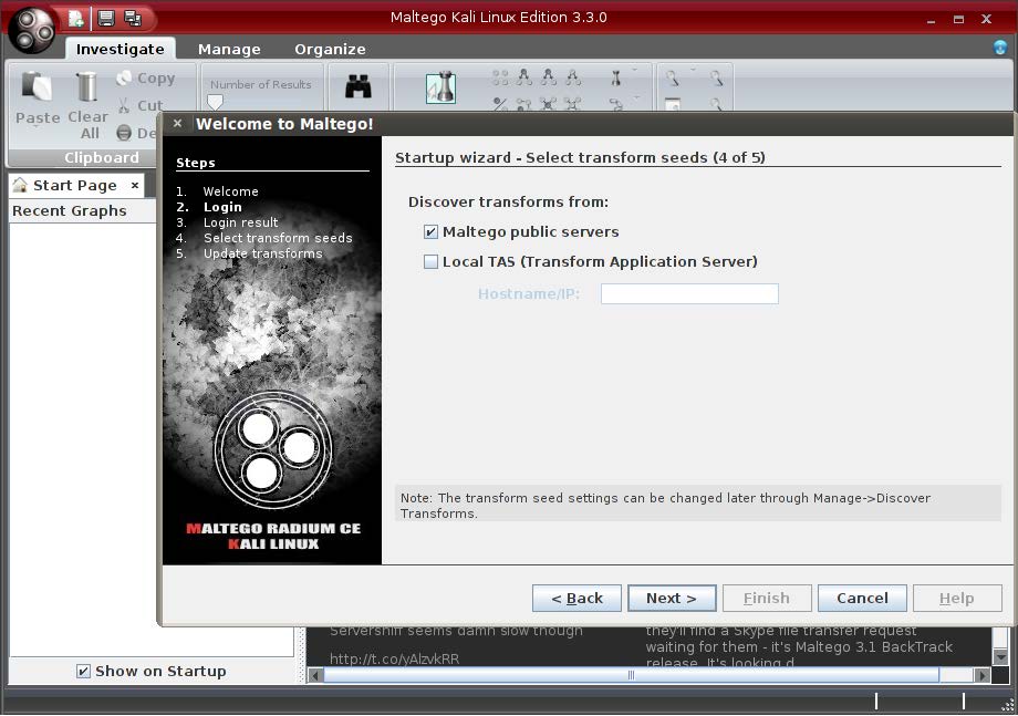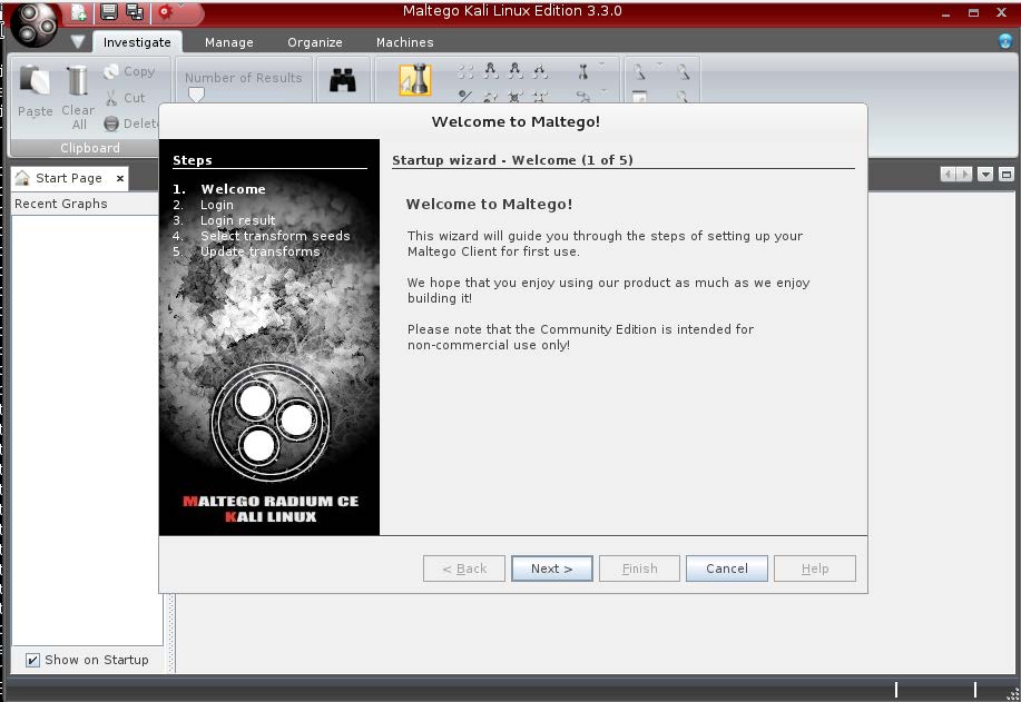 Applications | Kali Linux | Information Gathering | OSINT Analysis | maltego来启动Maltego。窗口如下:
