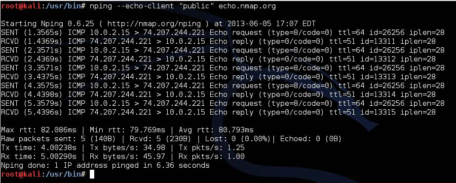 nmap -sP 216.27.130.162 Starting Nmap 5.61TEST4 ( http://nmap.org ) at 2012-04-27 23:30 CDT Nmap scan report for test-target.net (216.27.130.162) Host is up (0.00058s latency). Nmap done: 1 IP address (1 host up) scanned in 0.06 seconds我们也可以使用Nping(Nmap组件),它提供给我们更详细的结果: