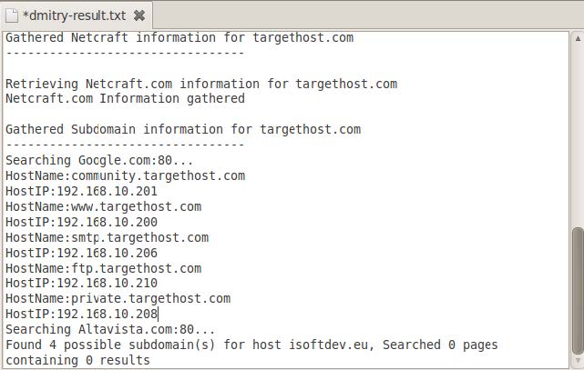 dmitry -wnspb targethost.com -o /root/Desktop/dmitry-result完成之后,我们应该在桌面上得到了一个文本文件,名称为