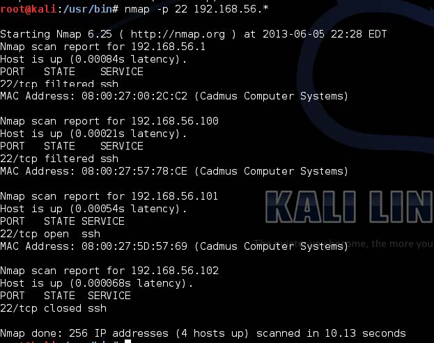 nmap -p 22 192.168.10.* -oG /tmp/nmap-targethost-tcp445.tx