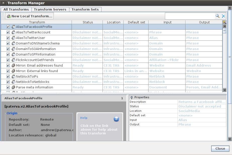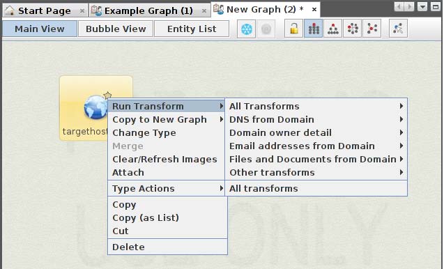 我们可以选择查找DNS名称,执行WHOIS查询,获得邮件地址,以及其它。或者我们还可以选择运行下面展示的全部转换。