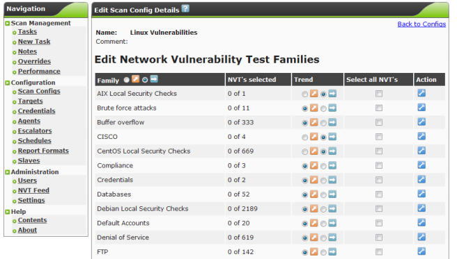 Select all NVT's框中的复选框。族是一组漏洞。选择的漏洞为:Brute force attacksBuffer overflowComplianceCredentialsDatabasesDefault AccountsDenial of ServiceFTPGain a shell remotelyGeneralMalwareNMAP NSEPort ScannersPrivilege EscalationProduct DetectionRPCRemote File AccessSMTP ProblemsSNMPService detectionWeb ServerWindowsWindows: Microsoft Bulletins